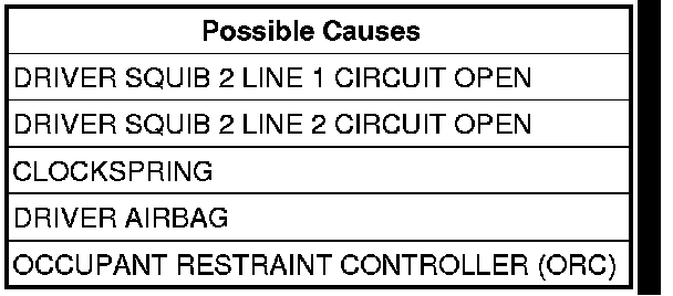 The Occupant Restraint Controller (ORC) monitors the resistance of the Driver Squib 2 circuits. The ORC will set this DTC if it detects an open or high resistance on the Driver Squib 2 circuits.