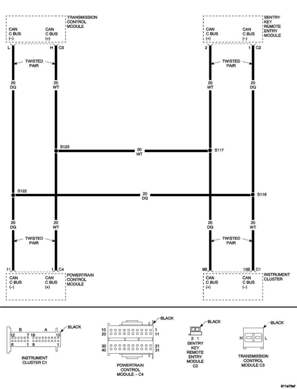 - Repair the CAN C Bus (+) circuit for an open between the Instrument Cluster C1 harness and the TCM C3 harness connector.