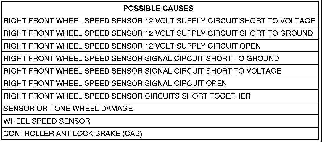 - Repair the Right Front Wheel Speed Sensor 12 Volt Supply circuit for a short to ground.