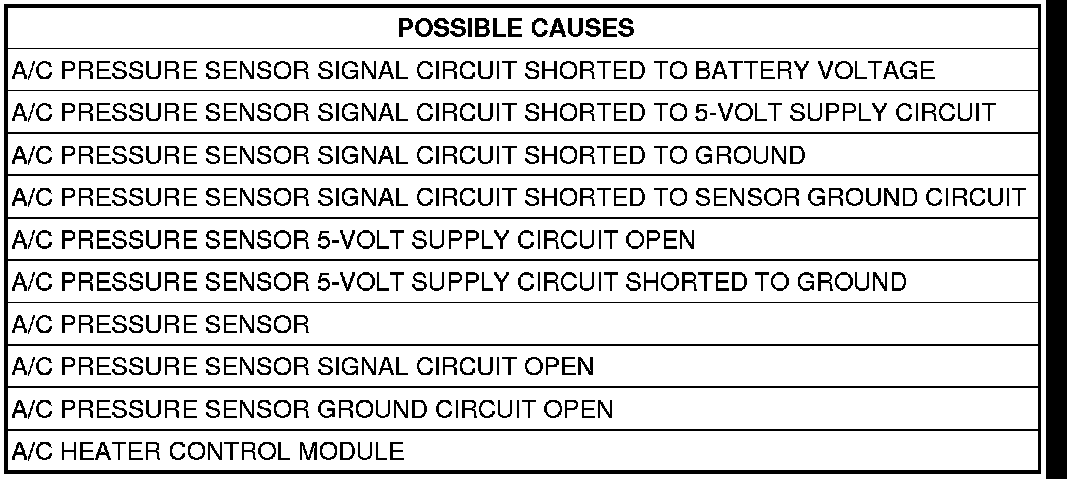 - Repair the A/C Pressure Sensor Signal circuit for a short to the 5-Volt Supply circuit.
