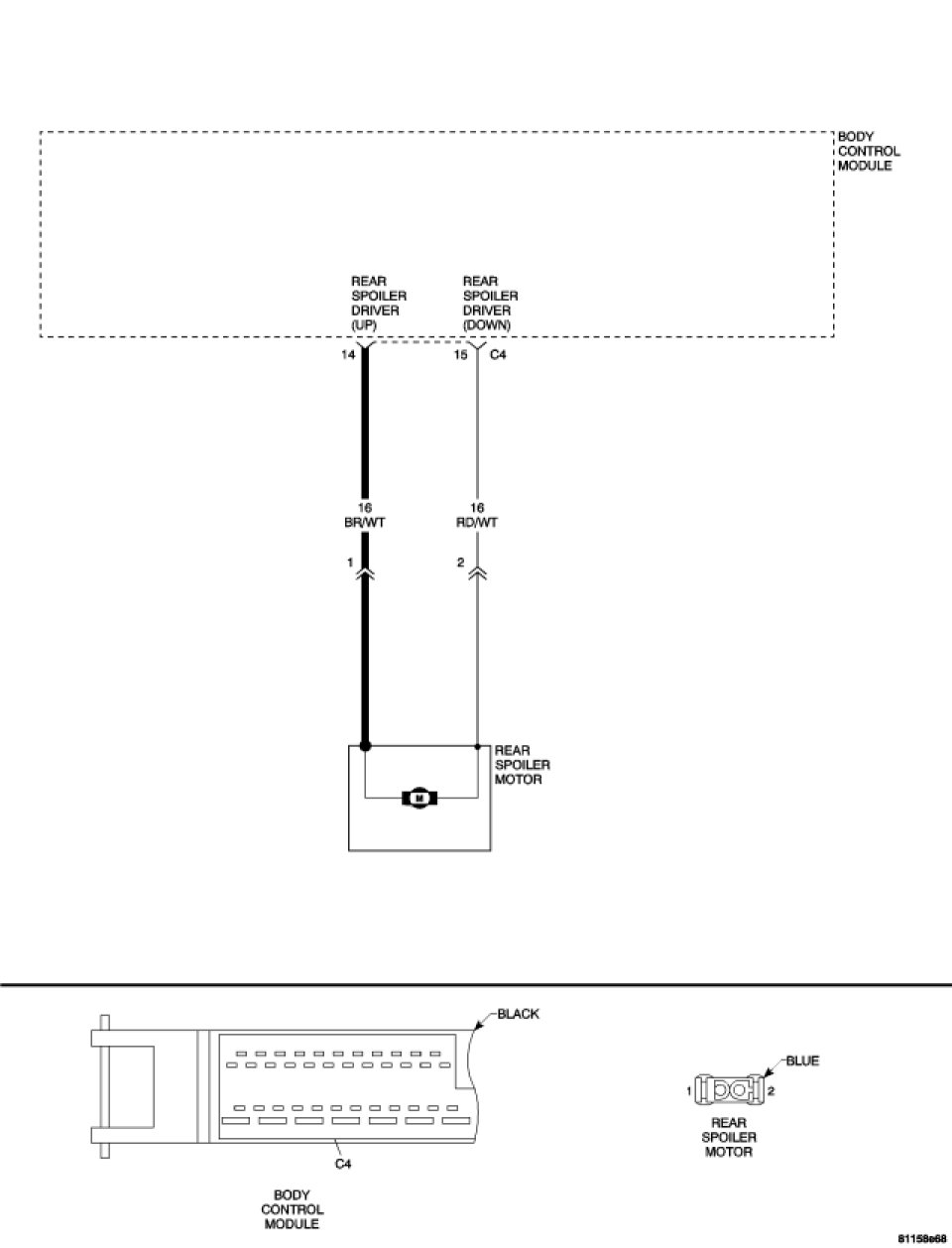 Measure the resistance of the Rear Spoiler Driver (Up) circuit from the BCM C4 harness connector to the Rear Spoiler Motor harness connector.