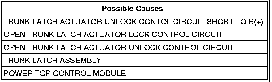 - Set Condition: When the Power Top Control Module (PTCM) senses B(+) on the Trunk Latch Actuator Unlock Control circuit.