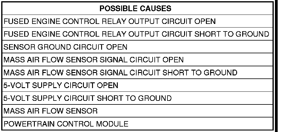 - Set Condition: The Mass Air Flow (MAF) Sensor value is less than 16 kg/h when the throttle valve angle is greater than 14° for approximately 5 seconds, or the MAF Sensor reading is greater than a calculated value that is determined by engine speed and throttle valve angle for approximately 5 seconds.