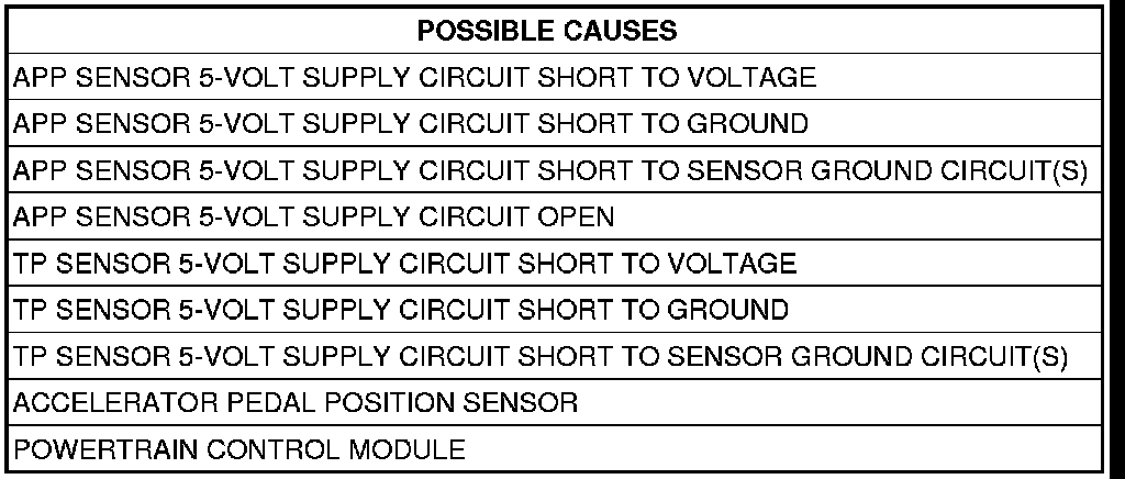 - Set Condition: When the PCM recognizes the APP Sensor 5-Volt Supply circuit voltage is below 1.0 volt or higher than 5.2 volts.