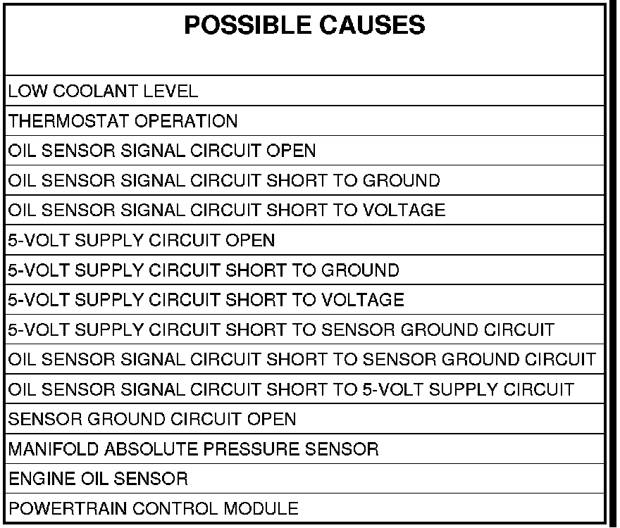 - Repair the Oil Sensor Signal circuit for a short to the Sensor Ground circuit.