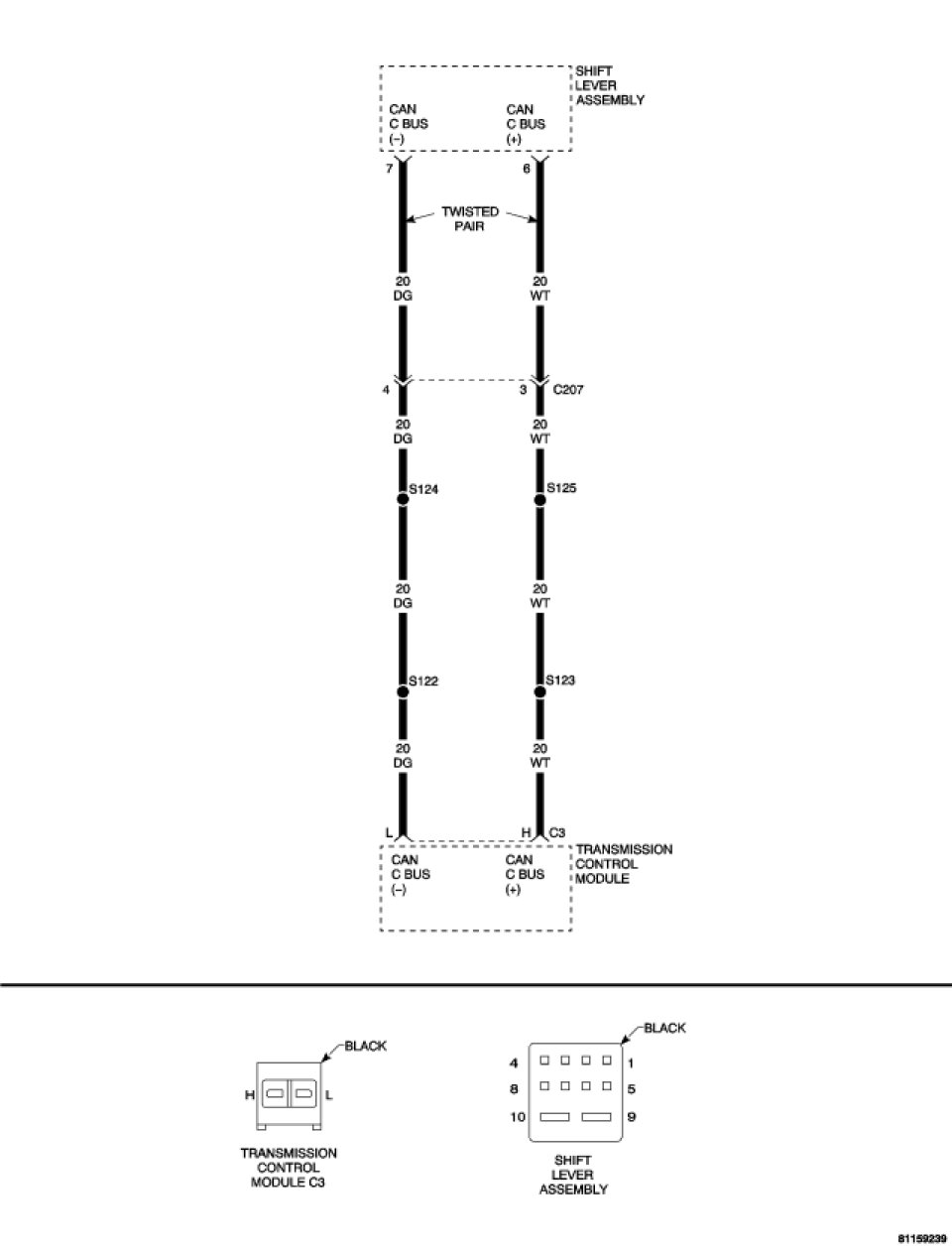 Measure the resistance from the CAN C BUS (+) circuit to the CAN C BUS (-) circuit at the Shift Lever Assembly harness connector.