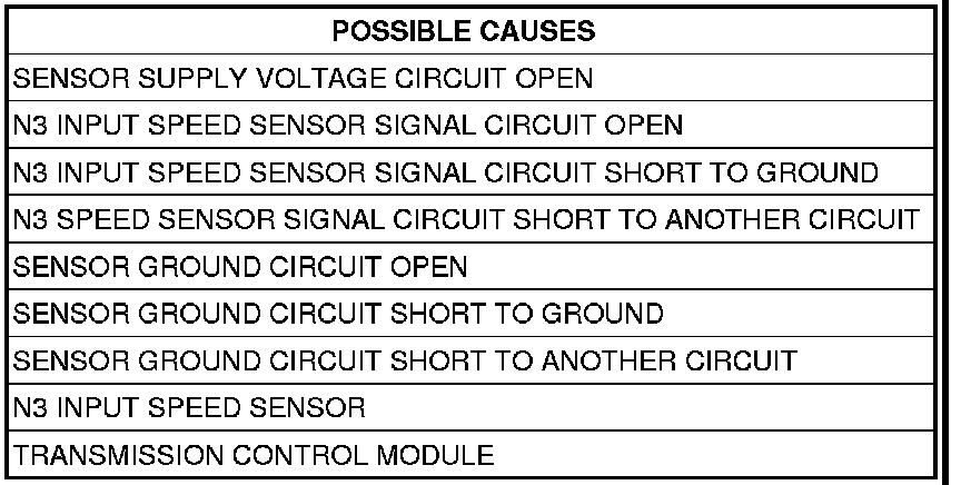 - Set Condition: If the N3 input speed sensor signal is equal to 0 RPM, short signal circuit to ground, shorted to battery, an open input speed sensor, a faulty input speed sensor, or an open sensor supply circuit.