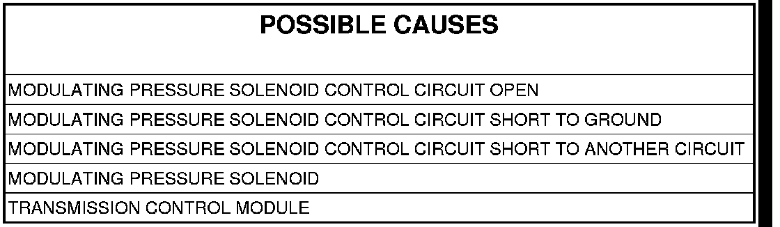 - Repair the Modulating Pressure Solenoid Control circuit for a short to ground.