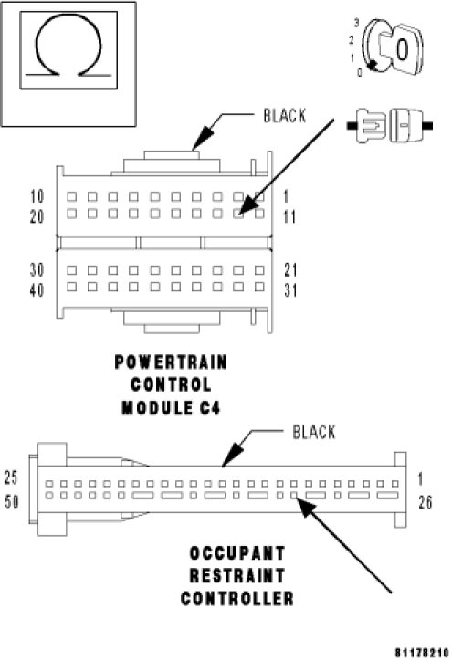 - Set Condition: The Occupant Restraint Controller (ORC) periodically sends out a signal to the Powertrain Control Module (PCM). If the PCM does not receive the signal from the ORC, the PCM will set this DTC.
