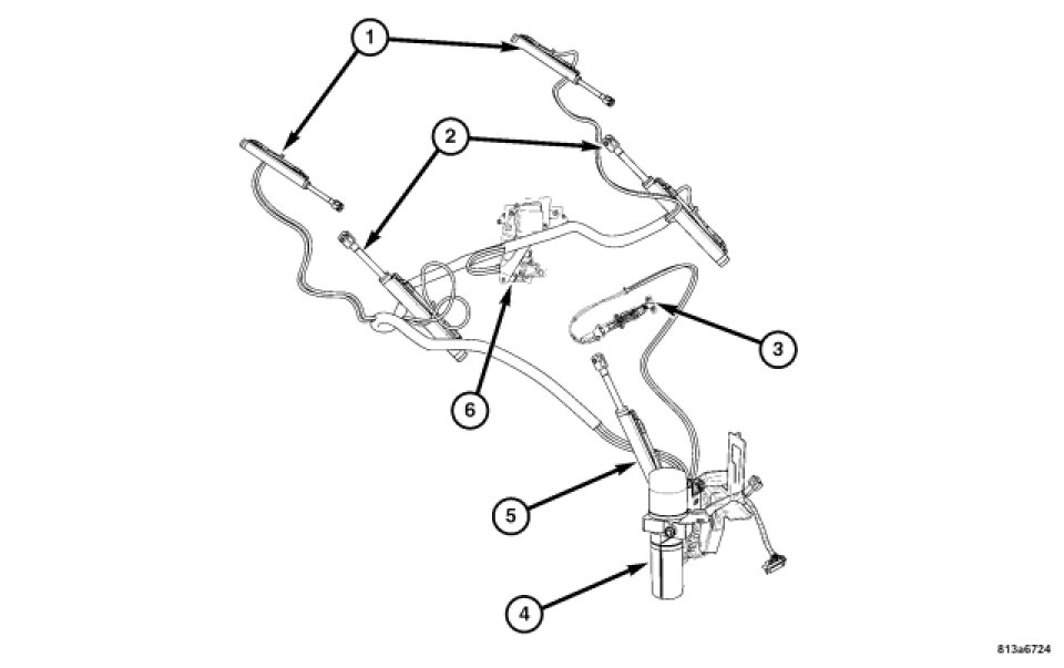There are 14 Hydraulic Lines that are attached to the Power Top Hydraulic Assembly (4). The lines connect to a variety of cylinders and latches on the Convertible Top. The Main Bow Cylinders (2), Rear Bow Cylinders (1), Tonneau Cover Cylinder (5), Tonneau Cover Latch (6), and the Rear Bow Latch (3). Each hydraulic cylinder has two hydraulic lines, one at the base side to raise the cylinder and one at the rod side to lower the cylinder.