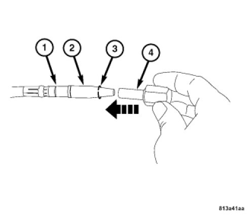 4. Using the Special Tool 9108 snap ring installer (4), push the metal snap ring (3) onto the coupling end of the hydraulic line (1).
