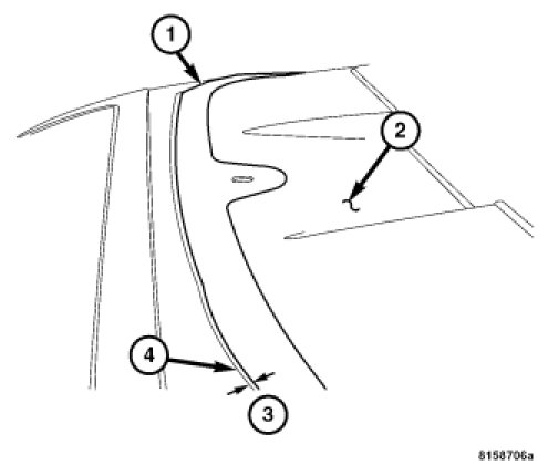 NOTE: Maintain a 2 mm (0.08 in.) gap (3) between the rear of the rubrail (1) and the edge of the tonneau cover recess radius (4).