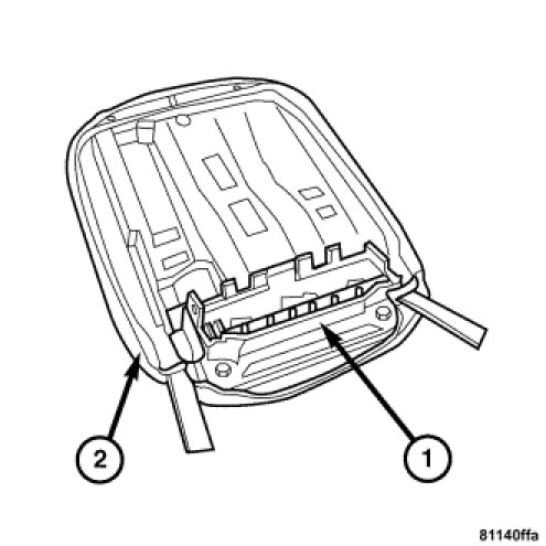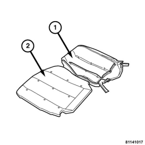 6. Fold the cover (1) to the side and unhook the upholstery straps from the wire insert in the foam rubber pad (2).