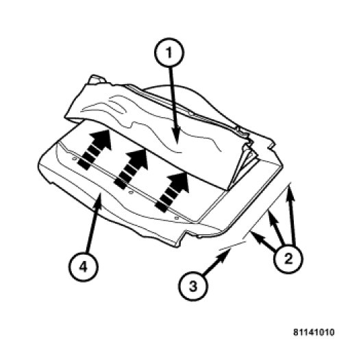 8. Fold the cover (1) to the side and unhook the middle upholstery straps (2) from the wire insert (3) in the foam rubber pad (4).
