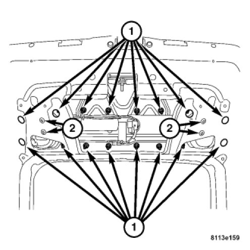 4. Install the mounting nuts (2) attaching the mounting plate to the rear liftgate. Tighten to 2.5 Nm (19 in. lbs.).