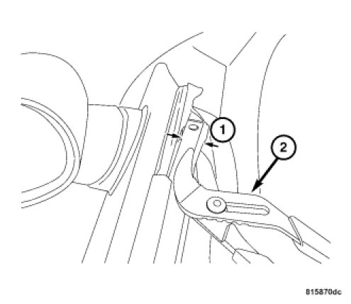 2. Verify that the inner window seal guide width (1) is 14-15 mm (0.5-0.6 in.). If necessary, bend the guide with tape-covered pliers (2) to achieve the correct gap.