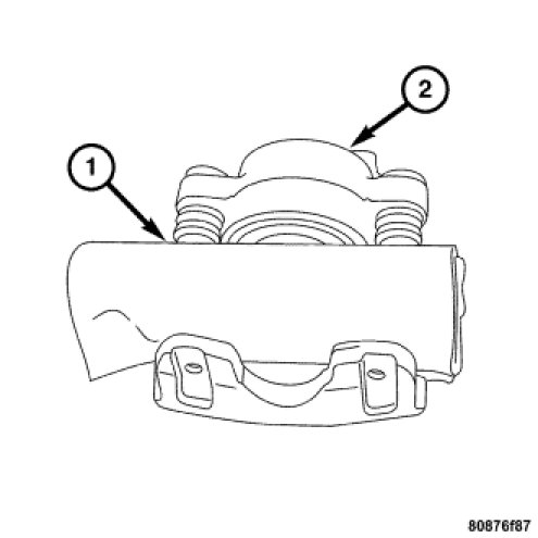 2. Take a piece of wood and pad it with a one-inch thickness of shop towels. Place this piece (1) on the outboard side of the caliper (2) in front of the piston.