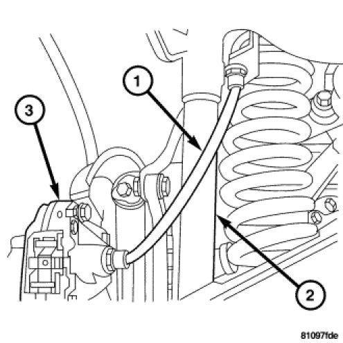 2. Route the brake hose (1) behind the rear shock (2) and connect to the caliper (3).