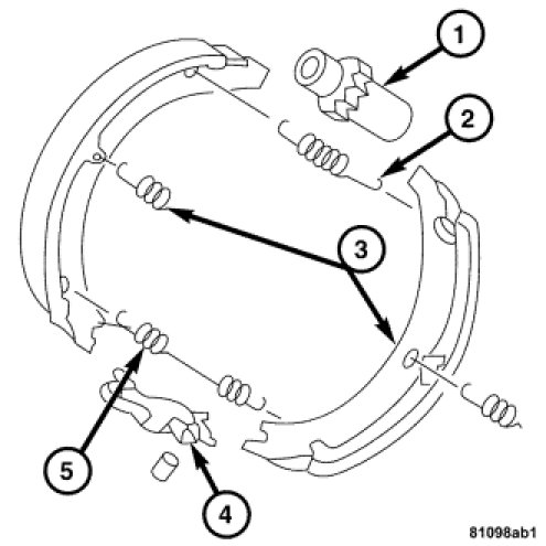 A set of drum type brake shoes are used for parking brakes. The shoes are mounted to the rear wheel hub. The parking brake drum is integrated into the rear disc brake rotor. The parking brake system consists of the adjuster (1), upper and lower return springs (2-5), hold down springs (3) and the actuator (4).