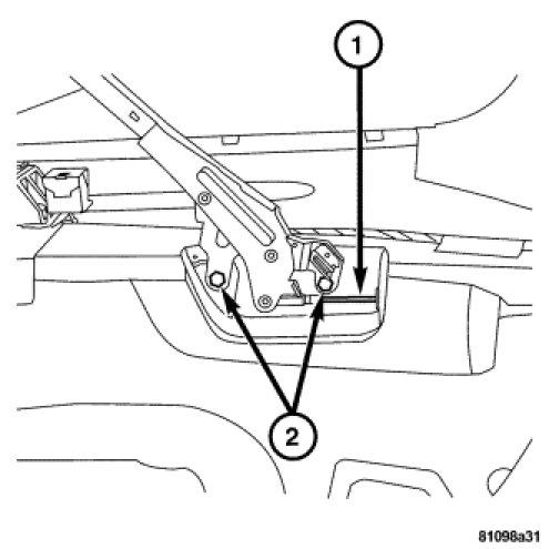 Parking brake cable (2) adjustment is controlled by the cable equalizer mechanism (1). The rear cables (2) are attached to the equalizer which uses a return spring to maintain tension and slides on the body. The front cable (5) is bolted to the equalizer (1) and the parking brake lever. The equalizer tensioner bolt (3) is used to take up the slack in the cables and as a final adjustment to the parking brake system.
