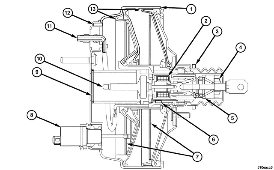 The full assistance from the brake booster is transmitted to the master cylinder from the output rod (10). When the brake application is terminated, the control module receives a signal from the BAS release switch (6) and the BAS solenoid valve (2) closes again. The BAS assistance is terminated.