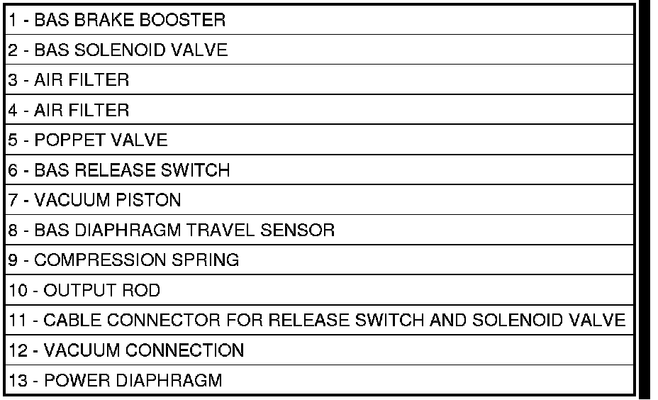 During an emergency stop condition, the BAS control module detects a rapid rate of brake application by the BAS diaphragm travel sensor (8). In the case of a BAS brake application, the BAS solenoid valve (2) opens the poppet valve (5), which admits atmospheric pressure from inside the vehicle from the air filters (3-4) located at the rear of the BAS vacuum-powered brake booster (1).