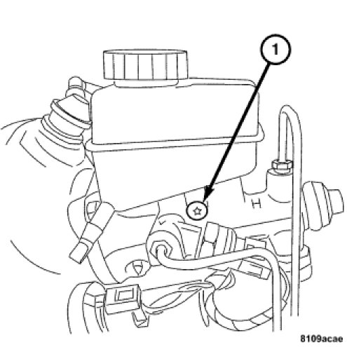 2. Install the screw (1) attaching the fluid reservoir to the master cylinder.
