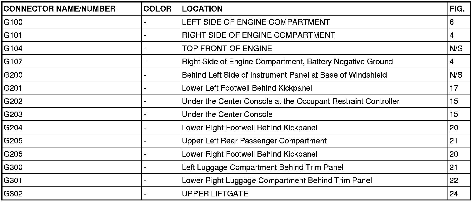 This section provides illustrations identifying connector, ground and splice locations in the vehicle. Connector, ground and splice indexes are provided. Use the wiring diagrams in each section for connector, ground and splice identification. Refer to the appropriate index for the proper figure number. For items that are not shown in this section N/S is placed in the Fig. column.