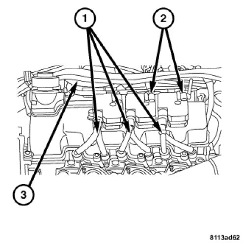 3. Route the engine vacuum hoses on the cylinder head cover retainiers (3).