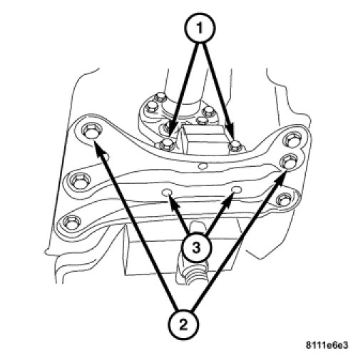4. Install the rear mount lower bolts (3). Tighten the bolts to 40 Nm (30 ft. lbs.).