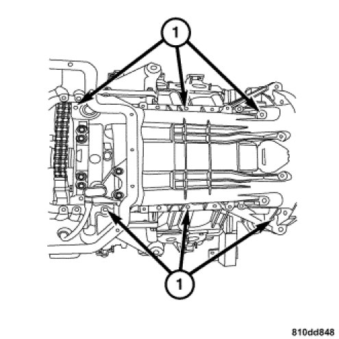 14. Remove the 24 upper oil pan bolts (1).