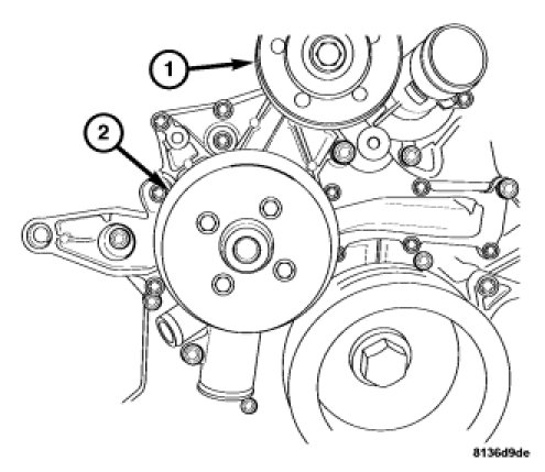 6. Install the water pump pulley (2) and bolts. Tighten the water pump pulley bolts to 10 Nm (89 in. lbs.).