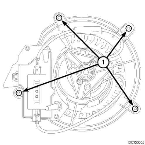 5. Remove the screws (1) attaching the blower motor to the heater housing.