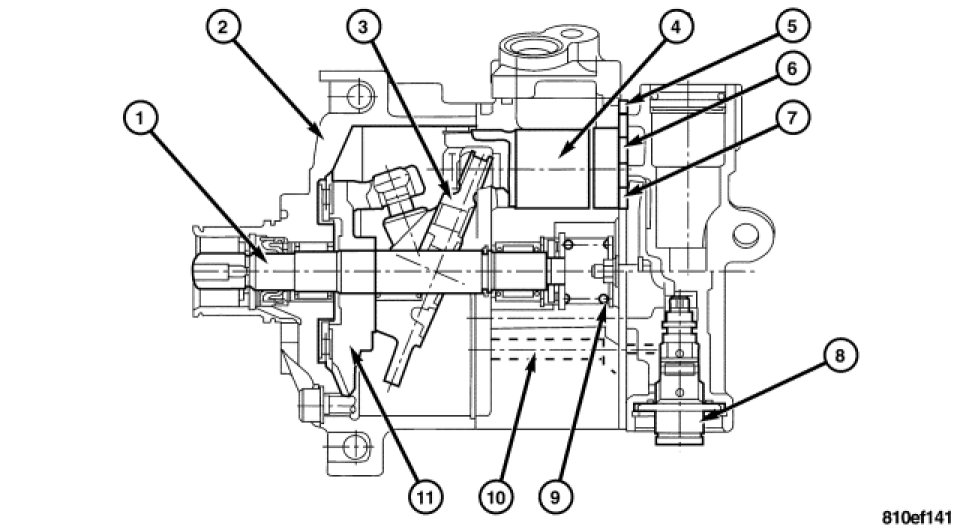 After the Electromagnetic Clutch has produced the frictional connection between the engine and the compressor, the drive shaft (1) drives the swash plate (3). The rotation of the inclined swash plate (3) causes the pistons (4) to move in strokes. During the intake stroke, refrigerant vapor is sucked in via the inlet valve (6). If the piston (4) moves in the counter direction, it delivers the refrigerant vapor via the pressure control valve (7), with the vapor being compressed and heating up, into the refrigerant line to the condenser.