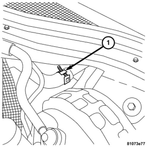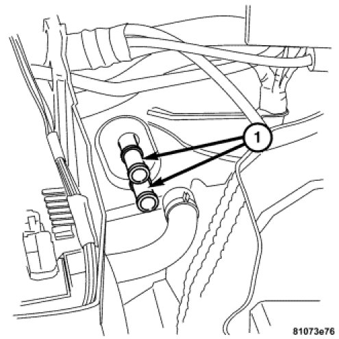 25. Install the hot water hose (1) the install the hot water hose clamp located inboard to the brake booster on the bulkhead.