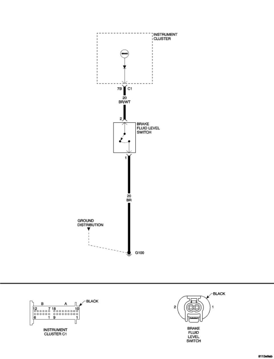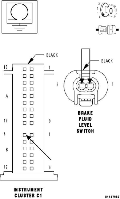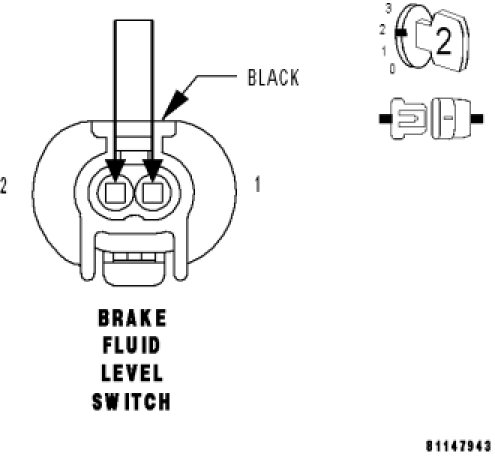 Connect a jumper wire between cavity 1 and cavity 2 of the Brake Fluid Level Switch harness connector.