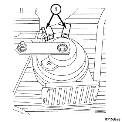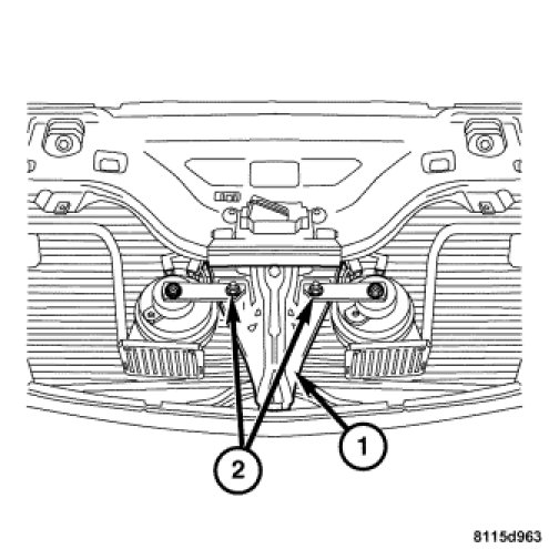 4. Remove the horn bracket mounting bolt (2) from the core support brace (1).
