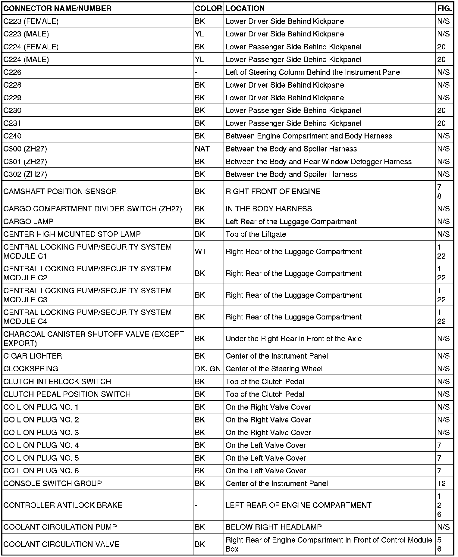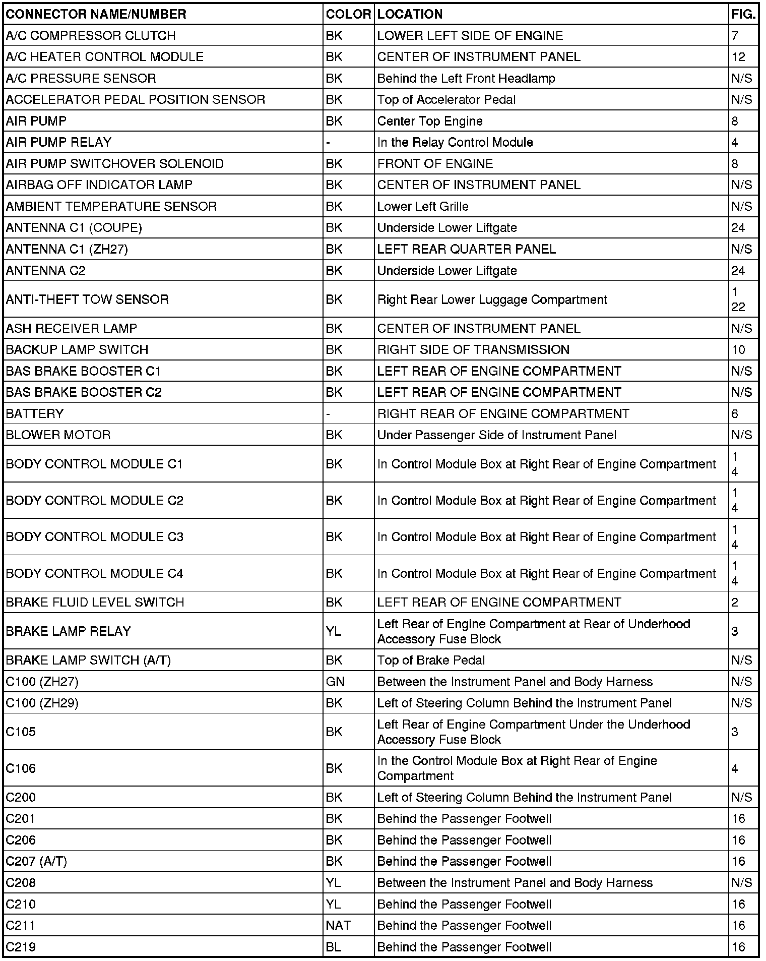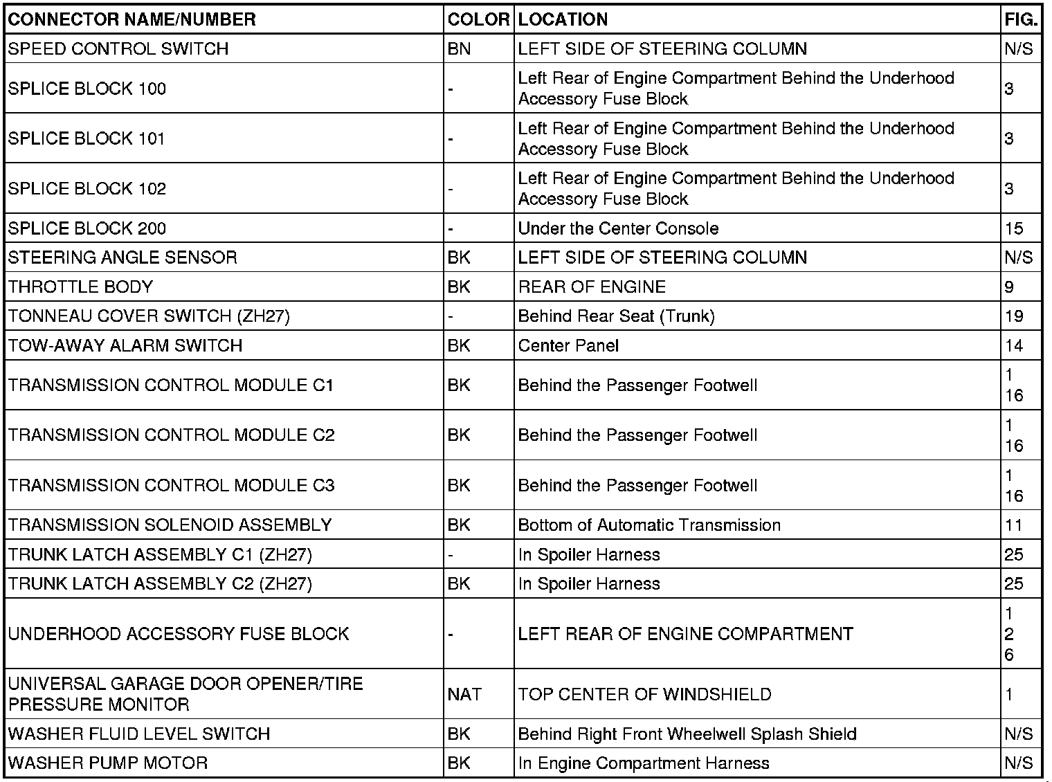 This section provides illustrations identifying connector, ground and splice locations in the vehicle. Connector, ground and splice indexes are provided. Use the wiring diagrams in each section for connector, ground and splice identification. Refer to the appropriate index for the proper figure number. For items that are not shown in this section N/S is placed in the Fig. column.