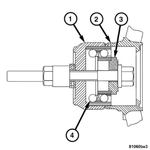 9. Using the Special Tool 9199 Hub Bearing Remover/Installer, remove the bearing (4) from the knuckle (2).