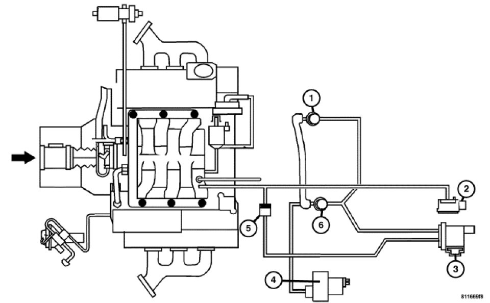 This vehicle is equipped with an Air Pump that injects air into the exhaust to reduce the emissions during engine warm-up. The air injected into the exhaust will cause the catalytic converters to heat up more quickly. This will improve the emission levels during a cold start. The Air Pump Switchover System incorporates an Air Pump (4) with two Air Pump Switchover Valves (1 and 6), an Air Pump Switchover Solenoid (3), an Air Pump Relay, a Vacuum Check Valve (5) and the PCM.