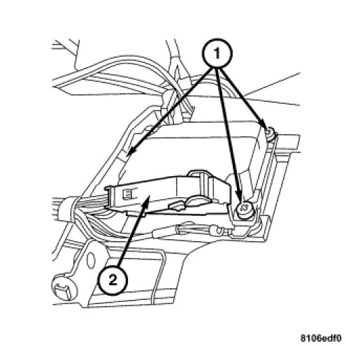 2. Install and tighten the screws (1) that secure the occupant restraint controller to the mount. Observe the ground lead mounting location on the left rear screw. Tighten the screws to 11 Nm (97 in. lbs.).