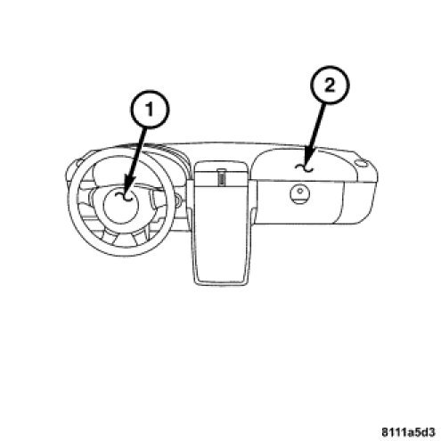 The driver airbag (1) is located in the center of the steering wheel, where it is secured with two screws to the steering wheel. Concealed beneath the driver airbag trim cover are the horn switch, the folded airbag cushion, the airbag cushion retainer, the airbag housing, the airbag inflator, and the retainers that secure the inflator to the airbag housing.