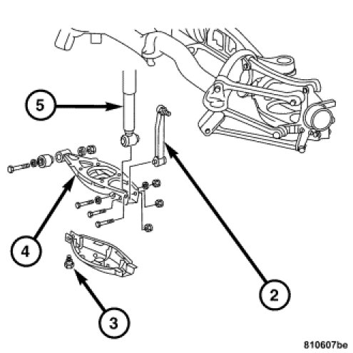 1. Install the bolt attaching the rear lower control arm (4) to the rear wheel carrier. Tighten to 70 Nm (52 ft. lbs.)