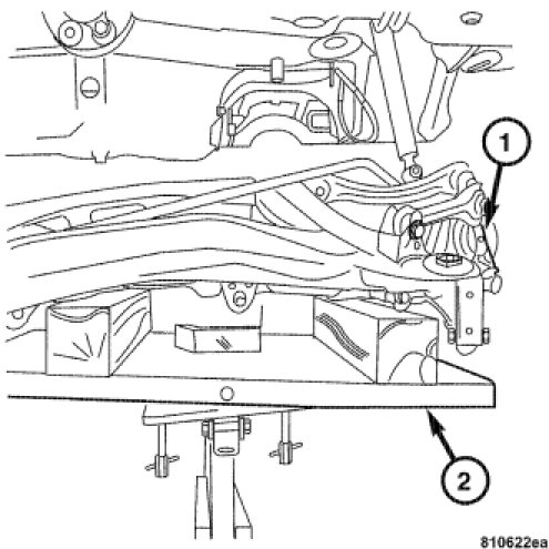 13. Remove the two bolts (2) attaching the rear axle carrier to the rear portion of the frame.