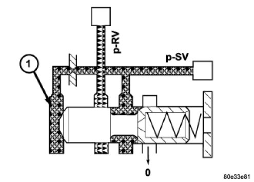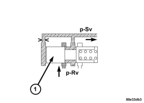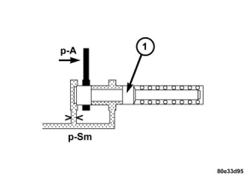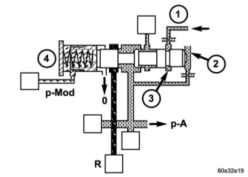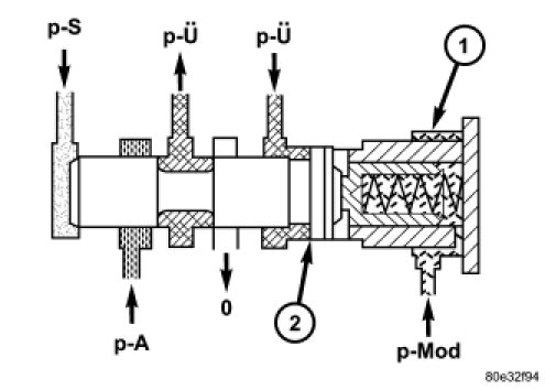 The shift pressure is determined by the shift pressure regulating solenoid valve and the shift pressure regulating valve (1). In addition, pressure from the clutch K2 is also present at the annular surface of the shift pressure regulating valve. This reduces the shift pressure in 2nd gear.