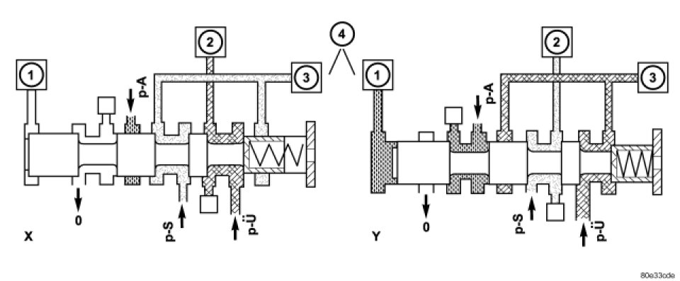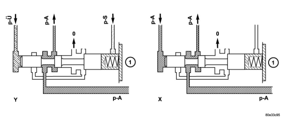 When the end face is unpressurized (stationary phase), the working pressure (p-A) is directed to the actuated shift element. If the end face of the command valve is subjected to the shift valve pressure (p-SV) (shift phase), then the shift pressure (p-S) is switched to the activating element and the overlap pressure (p-U) is switched to the deactivating element.