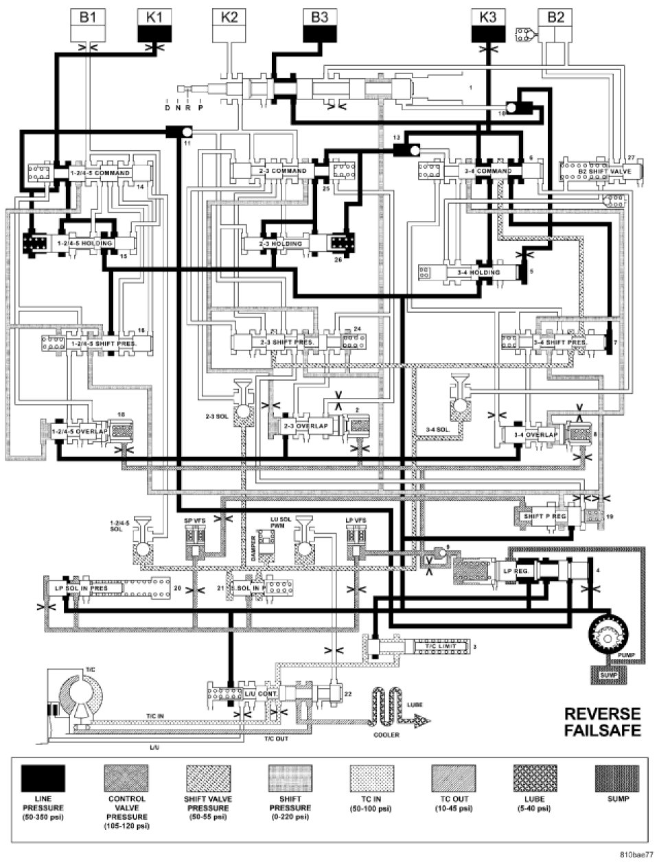 HYDRAULIC FLOW IN DRIVE - SECOND TO FIRST GEAR TRANSITION