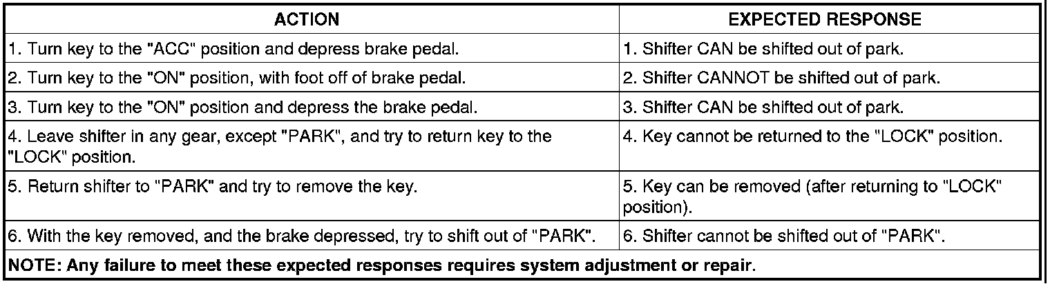 The following chart describes the normal operation of the Brake Transmission Shift Interlock (BTSI) system. If the "expected response" differs from the vehicle's response, then system repair and/or adjustment is necessary.
