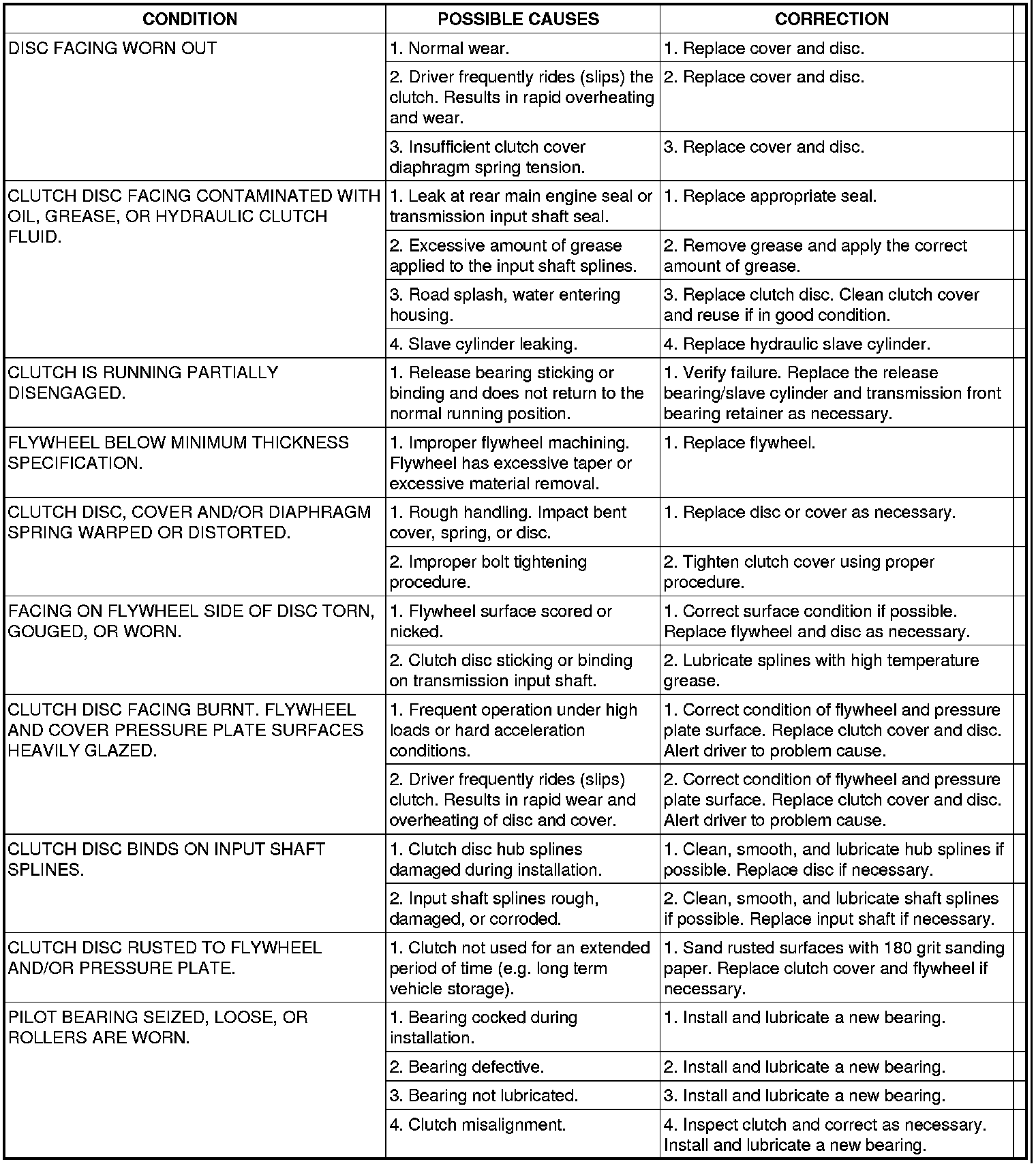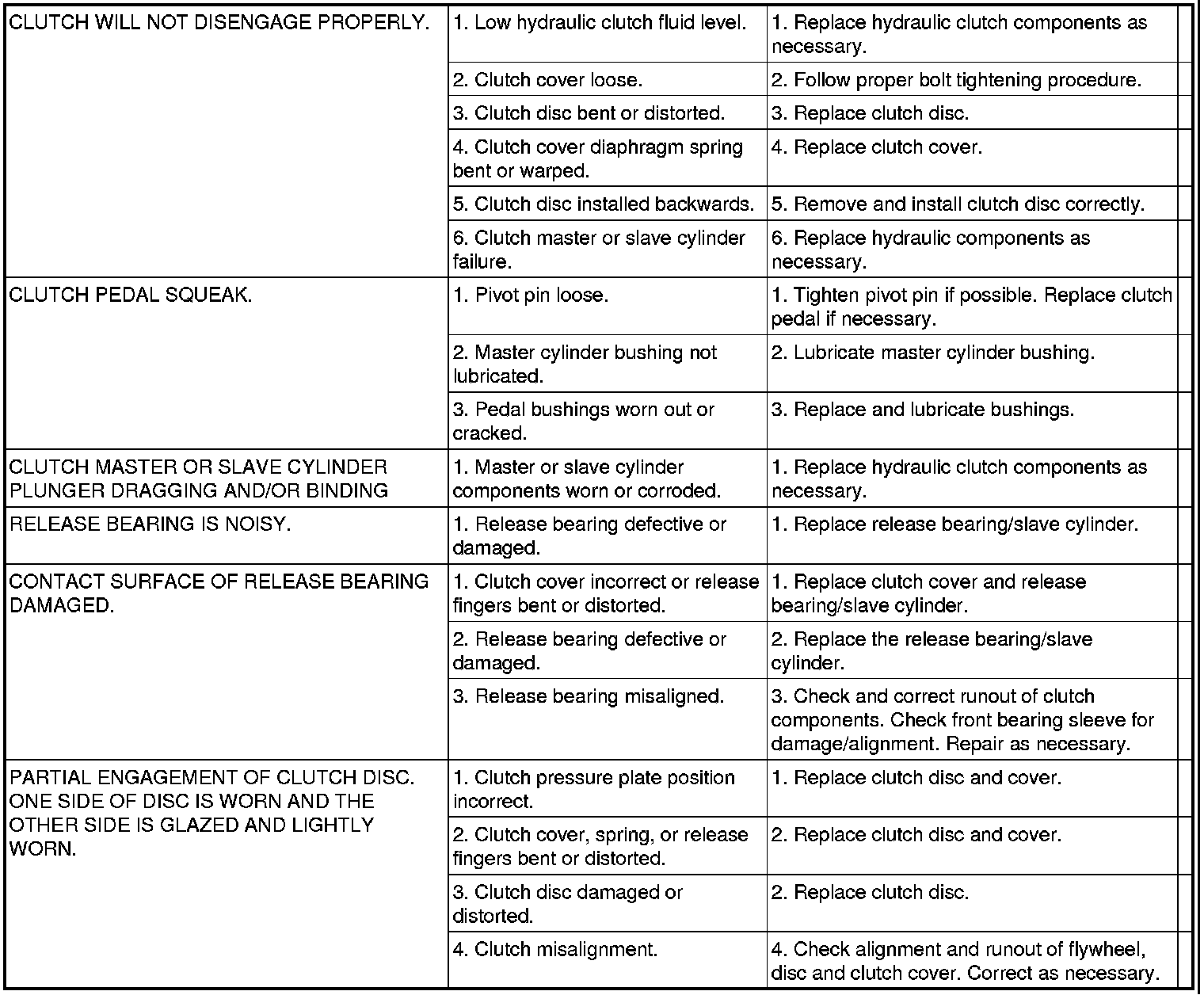 The diagnosis chart describes common clutch problems, causes, and correction. Conditions, causes, and corrective action are outlined in the indicated columns.