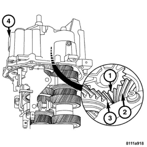 3. Fit the rear section of the transmission (4) over the main shaft and shift shaft. Align the reverse gear (1) to the gear sets as shown.